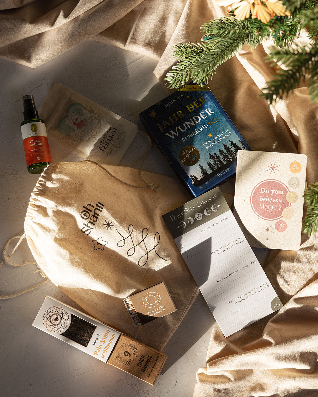 Ein besonderes Weihnachtsgeschenk, das nicht nur Freude schenkt, sondern dich auch wunderbar durch die magische Zeit der Rauhnächte begleitet. Unser Oh Shanti Weihnachtsbeutel vereint alles, was du brauchst, um das Jahresende achtsam und magisch zu gestalten.