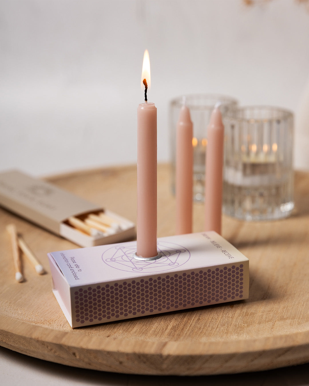 Wenn du eine Kerze anzündest, wird sie zu deinem kleinen Ritualmoment – ein Symbol für Fokus und Vertrauen. Lass deine Gedanken zur Ruhe kommen, richte dich auf deine Intention aus und spüre, wie mit jedem Atemzug mehr Zuversicht in dir wächst.