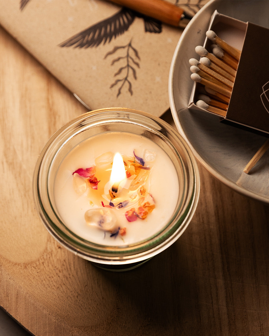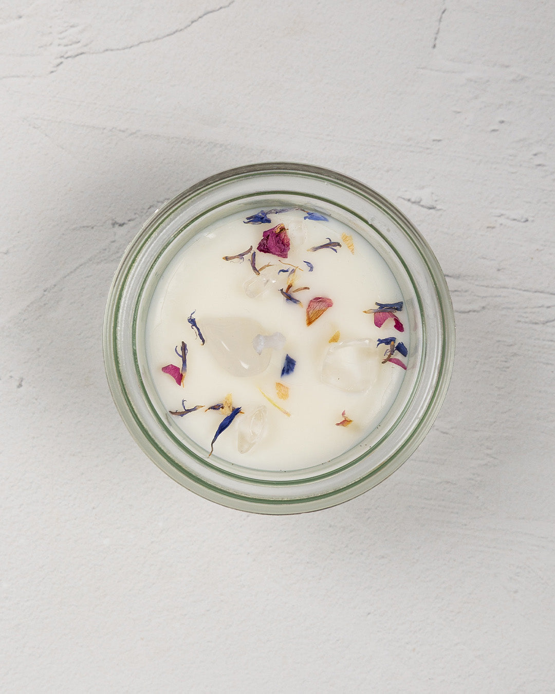 Jede Duftkerze wird aus 100 % Bio-Sojawachs von Hand gegossen und liebevoll mit echten Bergkristallen, Rosenblüten und Kornblumen veredelt. Die enthaltenen Bergkristalle stehen symbolisch für Klarheit, Fokus und energetische Reinheit – eine kraftvolle Unterstützung für all deine Rituale rund um Loslassen, Visionen und Intentionen.