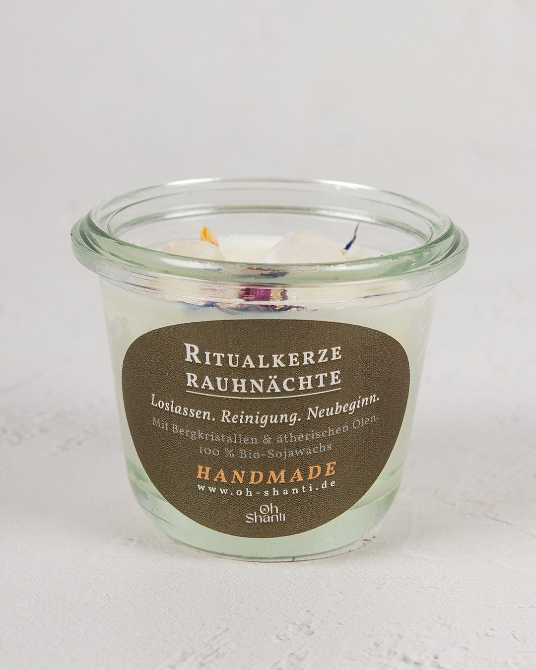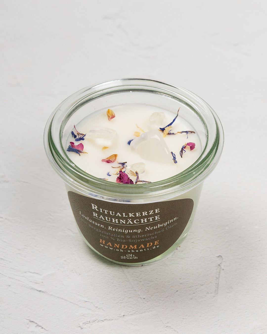 Die Rauhnächte Ritualkerze mit Bergkristallen ist ein achtsamer Begleiter für deine Rauhnächte 2025 – ein Licht, das dich durch die zwölf Nächte der Reflexion, Reinigung und Neuausrichtung führt.